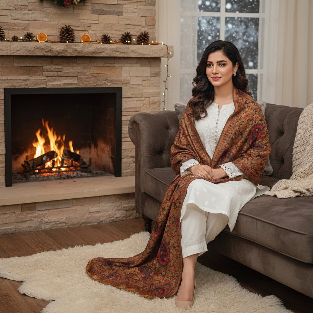 Embrace timeless elegance with the Bahaar Veil Shawl, a luxurious blend of warmth and style. Crafted from premium wool and adorned with exquisite printed detailing, this shawl adds a touch of sophistication to every outfit.