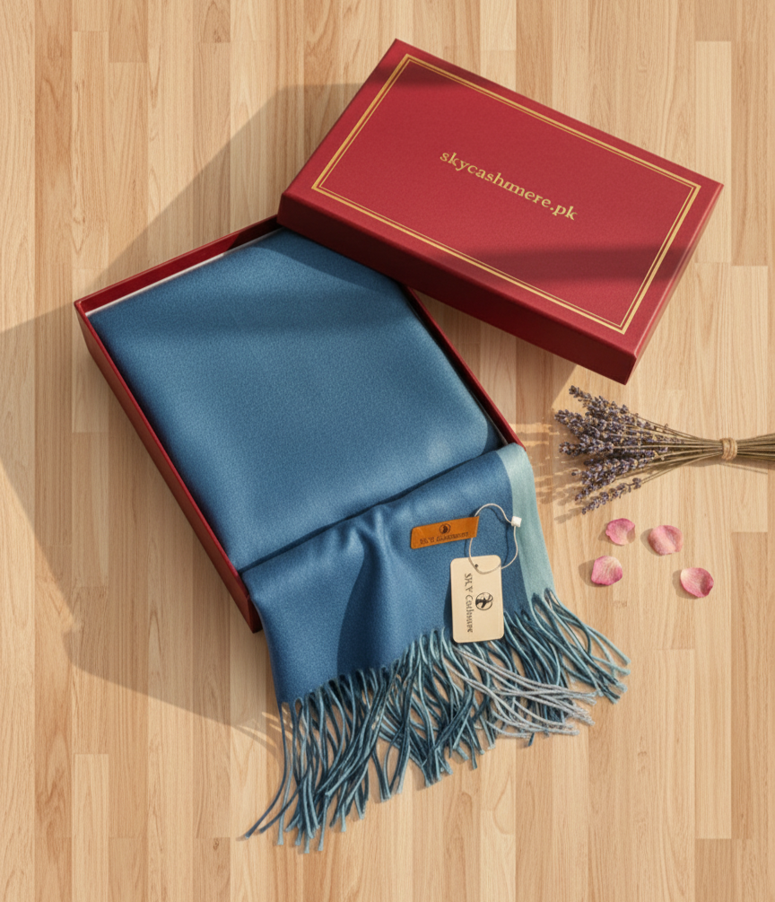 A two-tone shawl in sky cashmere features a luxurious blend of soft cashmere in two harmonious colors. The shawl showcases a gradient or contrasting color scheme, often with one hue as the primary shade and a complementary or contrasting secondary shade.