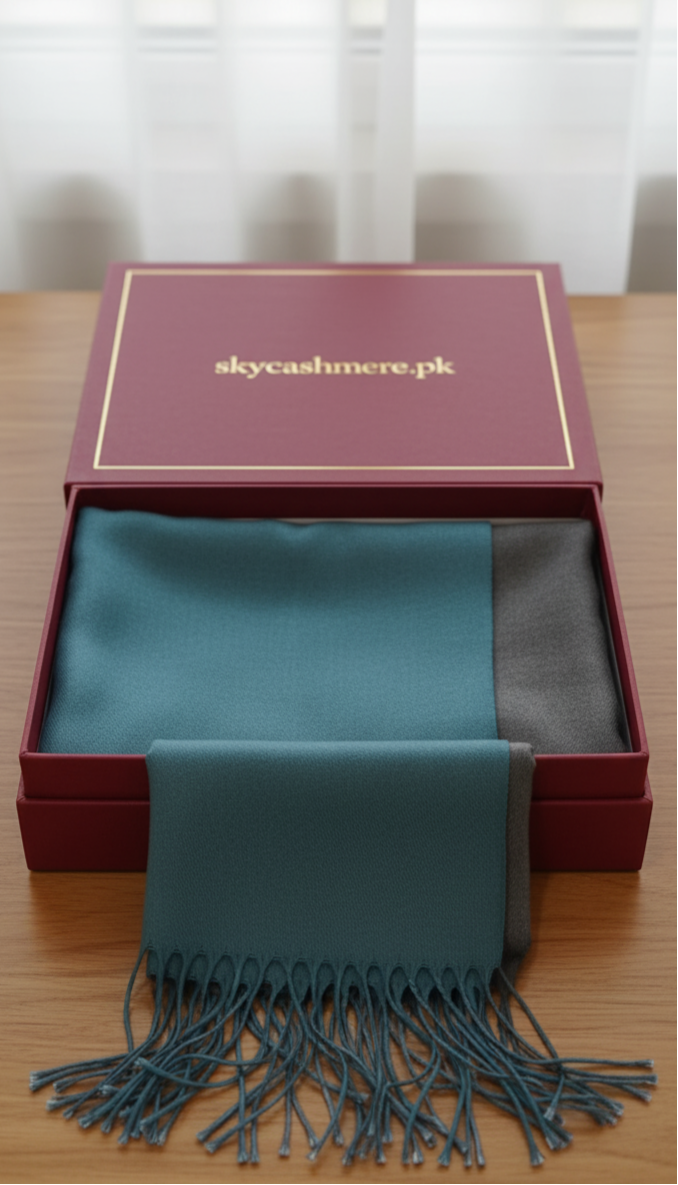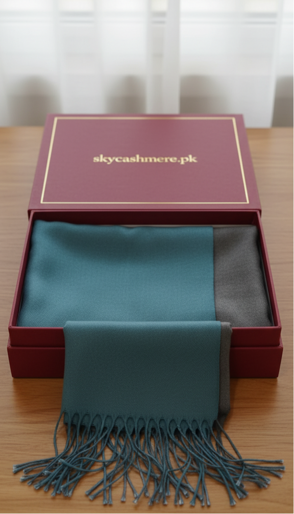 A two-tone shawl in sky cashmere features a luxurious blend of soft cashmere in two harmonious colors. The shawl showcases a gradient or contrasting color scheme, often with one hue as the primary shade and a complementary or contrasting secondary shade.