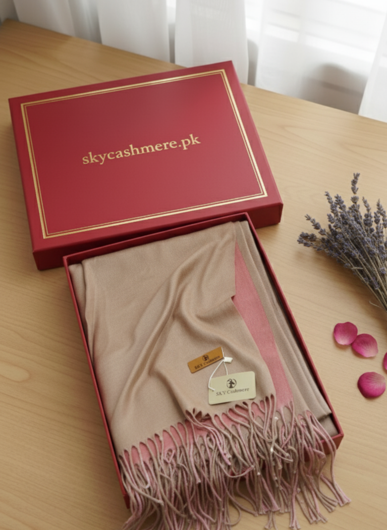 A two-tone shawl in sky cashmere features a luxurious blend of soft cashmere in two harmonious colors. The shawl showcases a gradient or contrasting color scheme, often with one hue as the primary shade and a complementary or contrasting secondary shade.